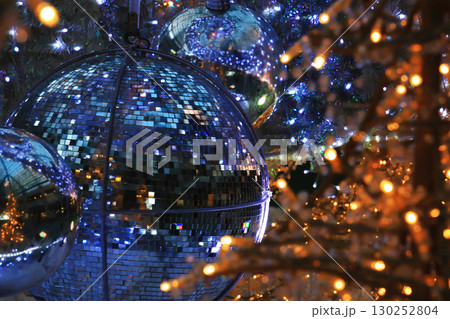 夜のクリスマスパーティのイベントでツリーの光を反射して輝くミラーボール