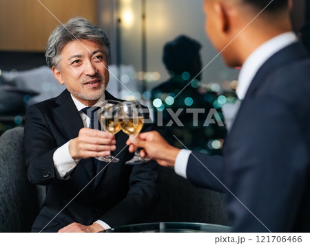 都市の夜景を背景に乾杯する多国籍ビジネスパーソン