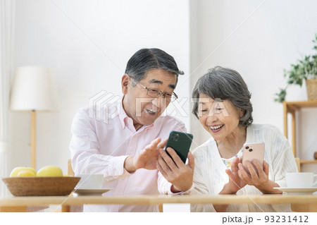 ソファーに座ってスマートフォンを操作している熟年夫婦 ライフスタイルイメージ