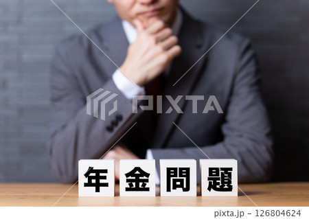 年金問題のブロックとスーツを着て悩むミドル男性ビジネスマン