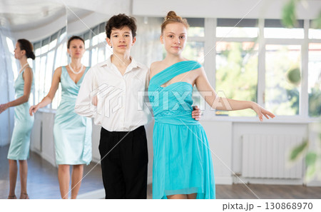 Dance teacher teaches a girl and a boy couples ballroom dancing