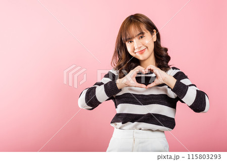A confident woman smiles and creates a heart symbol with two hands on a pink background. Asian portrait of a beautiful young female expressing love and happiness for Valentine's Day.