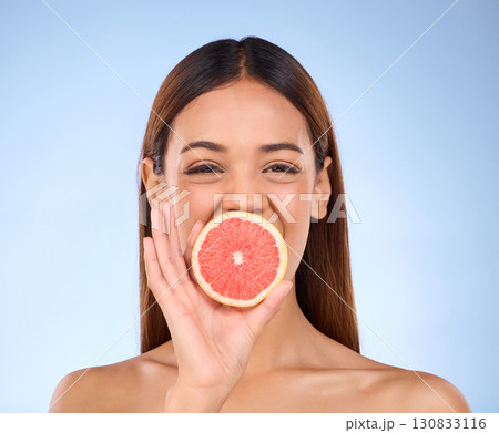 Grapefruit, woman and beauty face portrait for skincare dermatology and vitamin c. Female model on a blue background for self care, facial glow and healthy fruit for natural and clean skin in studio