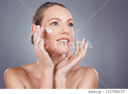 Portrait, skincare and lotion with a mature woman in studio on a gray background for antiaging beauty treatment. Face, product and cream with an attractive female in the bathroom to apply moisturizer
