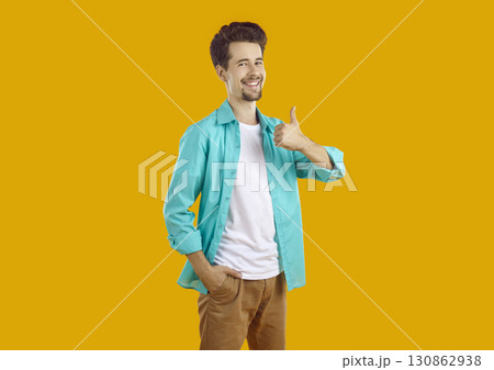 Happy, handsome groomed young man with neatly shaved beard and mustache smiles and gives thumbs up on isolated yellow background.