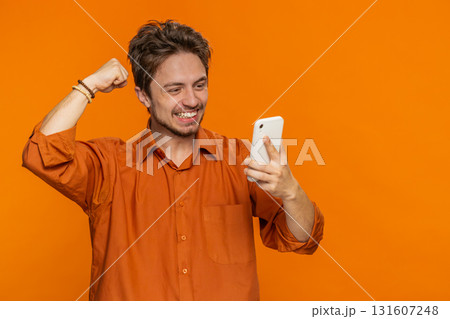 Happy excited winner man use smartphone celebrating success, winning play game, good lottery news