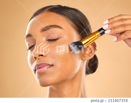Indian woman, face and makeup, brush and beauty with cosmetic tools and eyes closed on studio background. Skin glow, cosmetology and apply foundation or powder, cosmetics and peace with self care