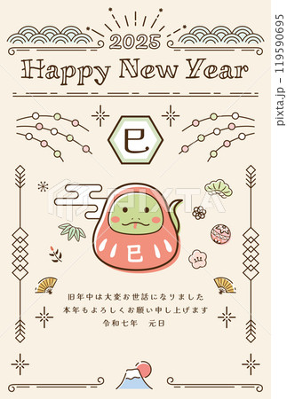 蛇と正月の縁起物の可愛い年賀状 2025 英字 手描き 線画