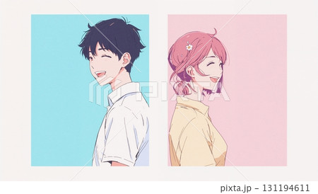 笑顔が弾ける男女、背中合わせで向き合うリラックスした雰囲気のイラスト