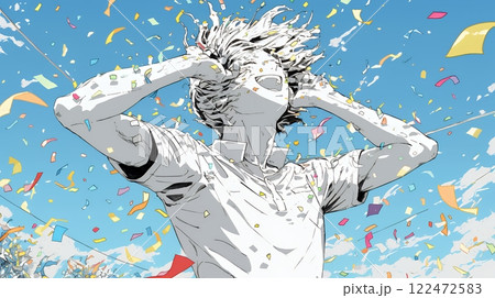 風に吹かれて笑う青髪の少女と向日葵畑の夏