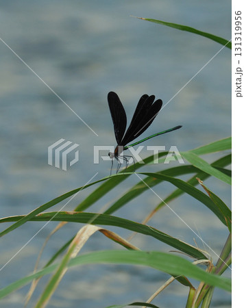 川遊びの人気スポット都幾川の石の上に止まる黒いハグロトンボ
