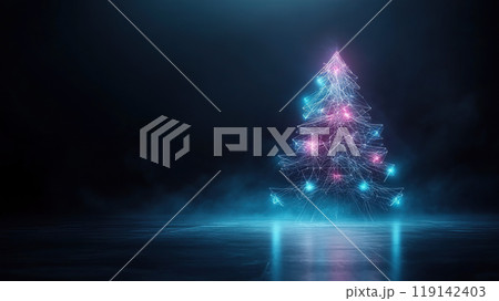digital Christmas tree glows with vibrant neon lights in dark, misty setting