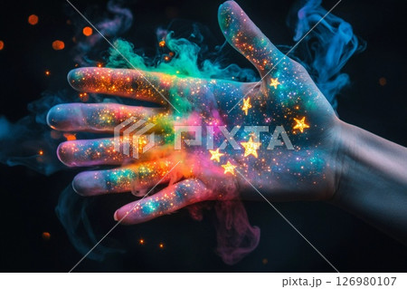Hands filled with colorful sparkles and swirling smoke create an enchanting visual effect in a dark setting