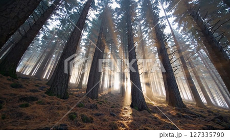 Golden sunlight filtering through misty pine forest, casting ethereal beams across towering evergreen trees, creating mesmerizing woodland atmosphere during serene morning light