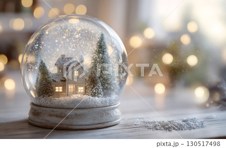 glass snow globe containing a miniature snowy house and pine trees