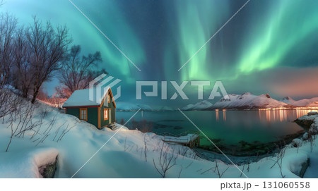 northern lights over snowy cabin by lake in winter night landscape