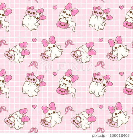 Coquette Halloween Ghost Seamless Pattern Retro Sweet and Spooky Ghost sheet with bow Doodle Repeat Background