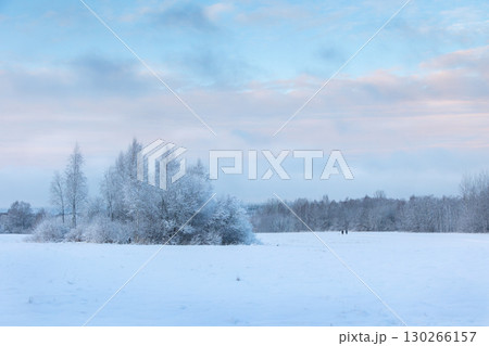Beautiful winter landscape with field of white snow and forest on horizon on sunny frosty day