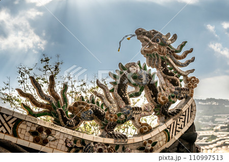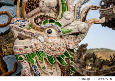 Dragon Mosaic Sculpture Adorning Pagoda Temple Rooftop, Architectural Elegance and Cultural Splendor.