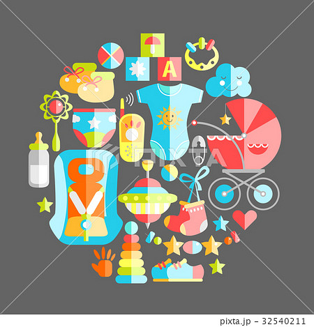 Cartoon Color Different Newborn Belongings Object Set Kids Accessories Childhood Concept Flat Design Style. Vector illustration