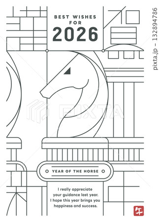 シンプルでアールデコ調なチェスをモチーフにした、白地の2026年午年の年賀状