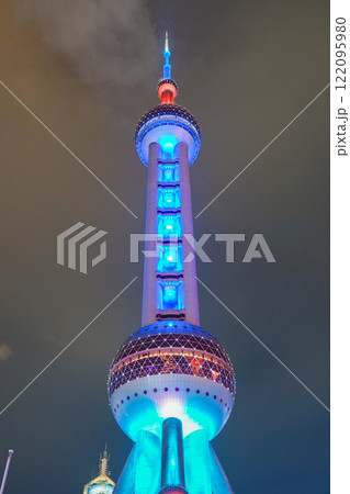 中国上海・ライトアップされた夜の東方明珠塔