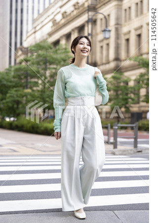 オフィス街を歩く30代のビジネスウーマン カメラ目線