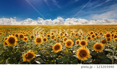 Vibrant Sunflower Field Under a Bright Blue Sky with Clouds