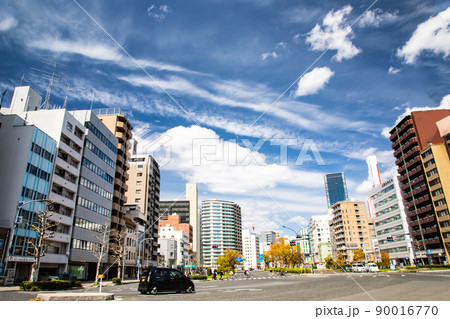 広島駅前通りの交差点付近の街路風景です。ドラマチックな青空と雲をご覧ください。広島市
