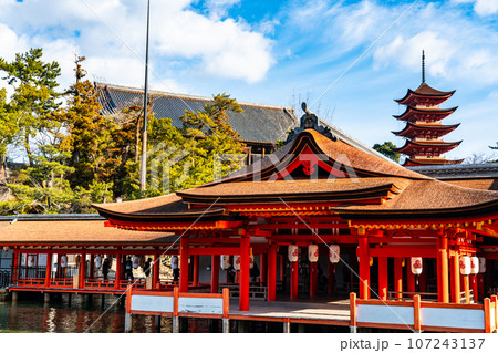 【世界遺産 嚴島神社】【安芸国一宮】晴れた新年の拝殿と千畳閣と五重塔1 広島県廿日市市