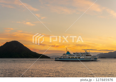 秋空の夕焼けの中、宇品港から出港するフェリー
