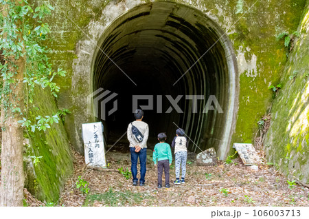幻の鉄道遺産 広浜鉄道今福線 今福第一トンネルの前に立つ親子 島根県浜田市