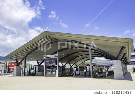 初秋の朝の広電宮島口駅の駅舎2 広島県廿日市市
