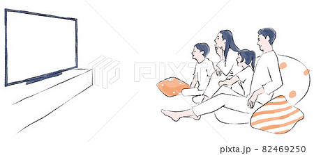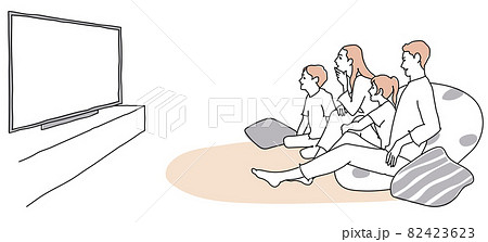 大きなクッションにもたれて楽しそうにテレビを観る家族 手描き風線画