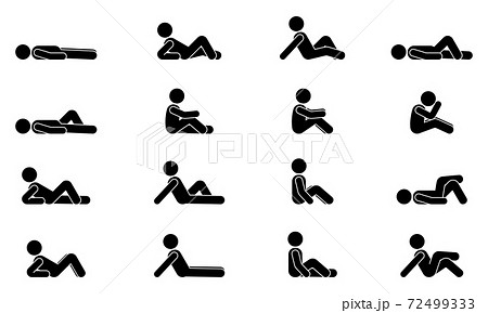 Stick figure male lie down various positions vector illustration icon set. Man person sleeping, laying, sitting on floor, ground side view silhouette pictogram