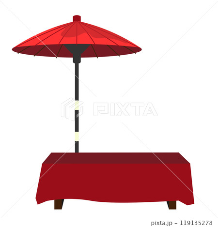 緑茶が置かれた床几台と野点傘のベクターイラスト