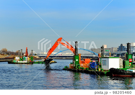浚渫工事:川底の土砂をすく浚渫工事:川底の土砂をすくい取る浚渫船い取る作業台船