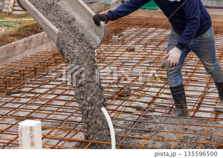 Closeup shot of concrete casting on reinforcing metal bars of floor in industrial construction site