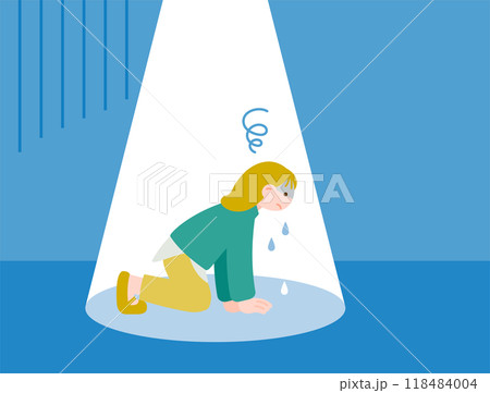 ドン底に落ち込み倒れる女性のイラスト。立ち直れないほどの不運。暗い部屋で呆然と仰向けになって寝る人。