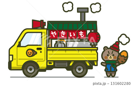 真横の軽トラックと熊の石焼き芋屋さんのイラスト(黄色い車と温かい雰囲気)
