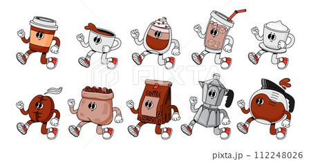 Coffee character. Vintage cute cups with drink for breakfast. Cartoon walking mug beverage and beans for coffee shops, cafe, cafeteria. Mascot caffeine espresso maker. Vector set