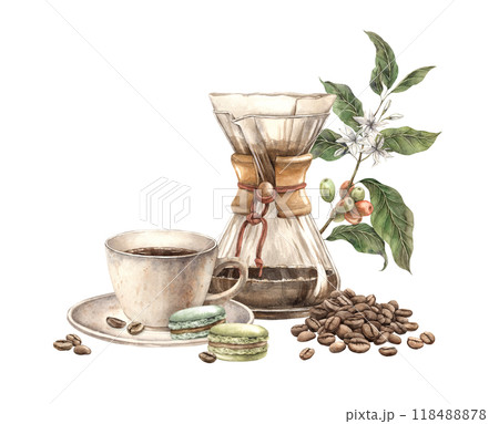 Ceramic cup with coffee filter, pistachio macaroons and roasted beans. Botanical branch of coffee with fruits and flowers. Watercolor composition for decorating shops, cafes, banners, postcards