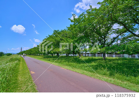 新緑の東京都府中市押立町5丁目の府中多摩川かぜのみち(多摩川歩道)から西側に向かって見る