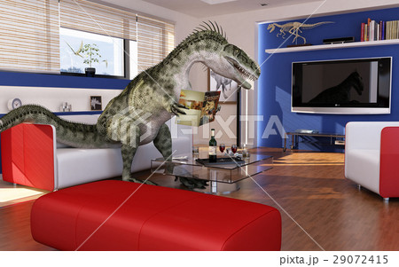 Modern livingroom with a theropod dinosaur, sitting on the sofa, reading a dinosaurs book.
