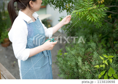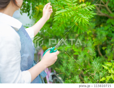 岩手県滝沢市 桜の咲く庭の手入れをする女性