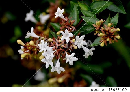 初夏の庭に咲く白いハナツクバネウツギ(アベリア)の花
