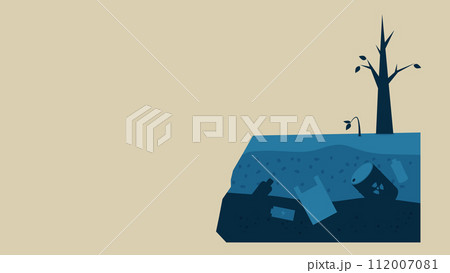 土壌汚染。土の中にペットボトルや電池や汚染物質があります。その周りの木は枯れています。