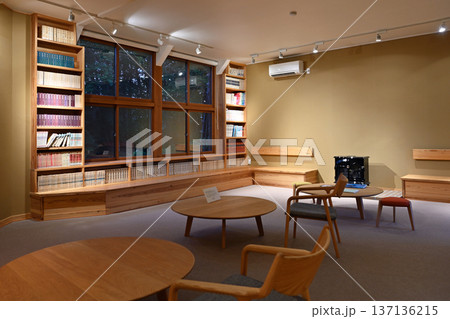 新潟県十日町市の木造校舎を改装した温かい光が灯る夜の談話室
