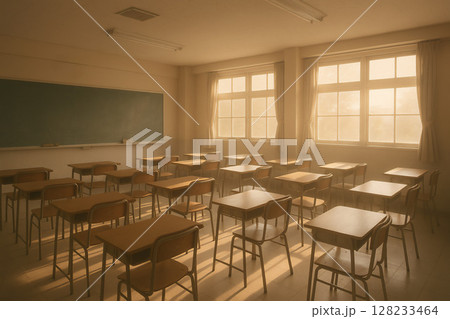 懐かしい 小学校校舎 教室 机と椅子 校舎 窓ガラス
