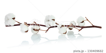 Cotton branch with flowers isolated on transparent background, natural eco friendly plant, dried floral element, mockup template for design and decoration. Full focus photo